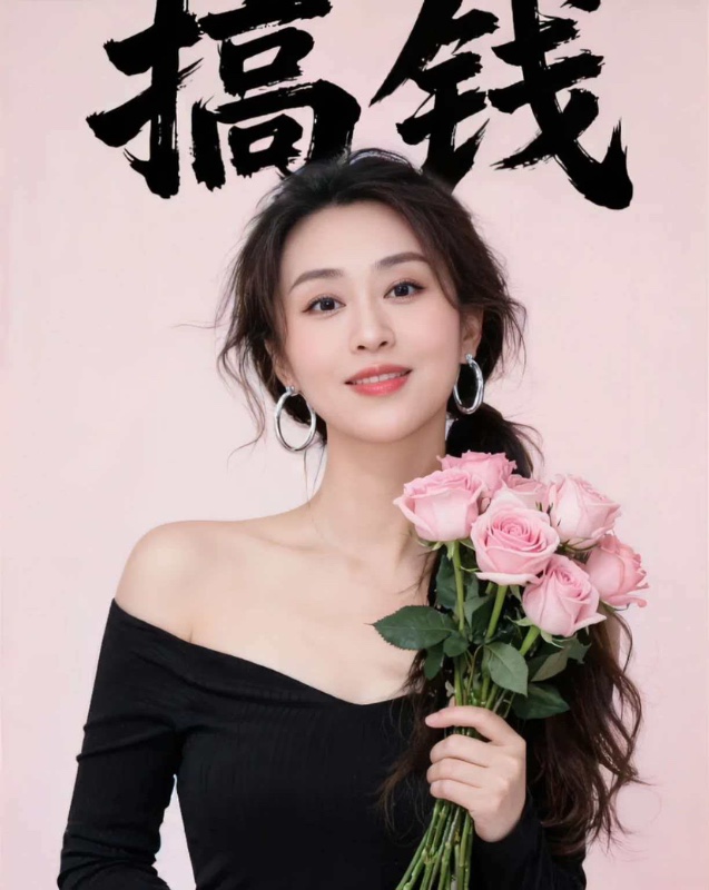 黑裙露肩 + 粉玫瑰